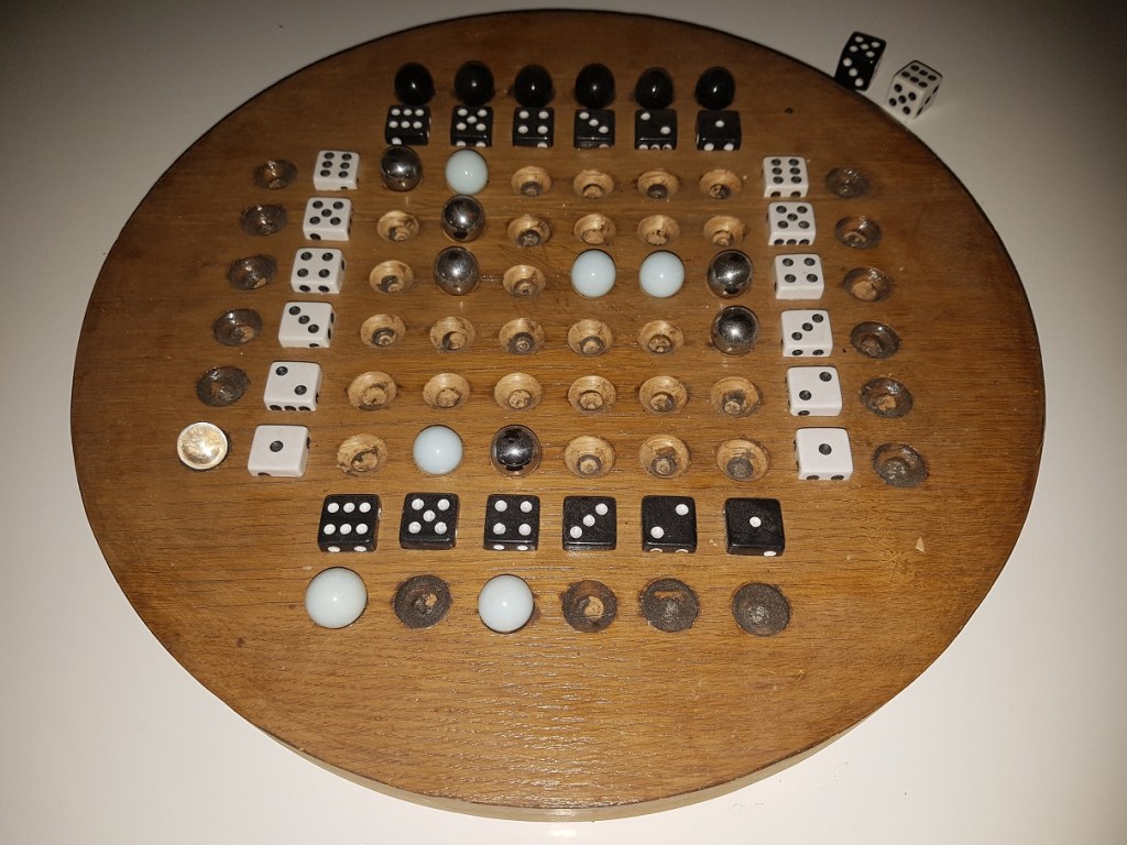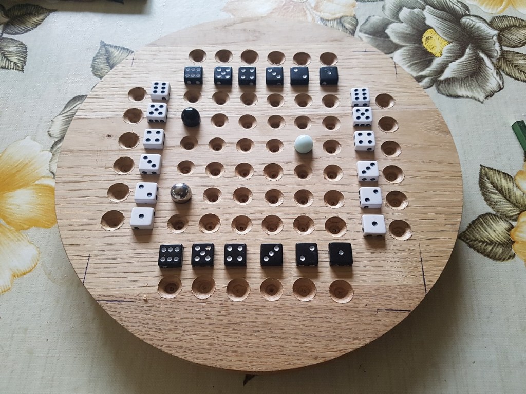 Le dessin d’une grille & quelques « copier/coller » d’images de dés me permettent de créer un plateau en image numérique. Ne me reste plus qu’a imprimer & encadrer l’image pour parfaire & embellir le premier prototype.